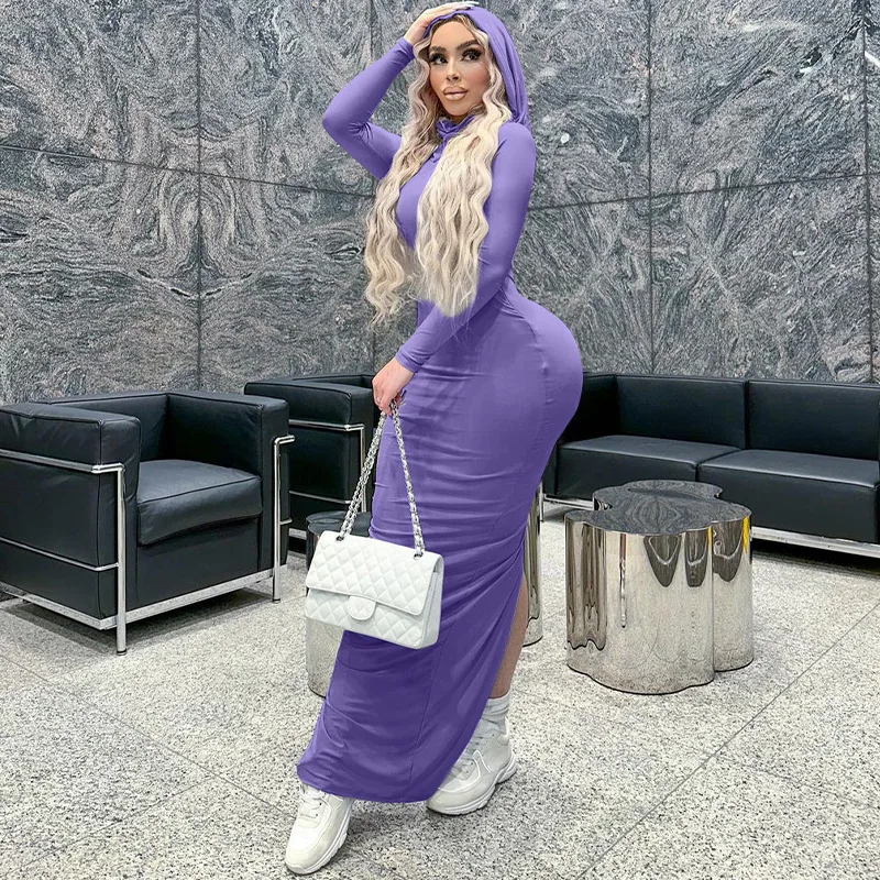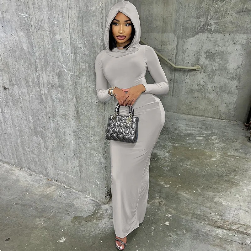D3512950A Solid Hooded Maxi Dresses Ladies Fall New Slim Dress Full Sleeve Skinny Women Casual Dresses